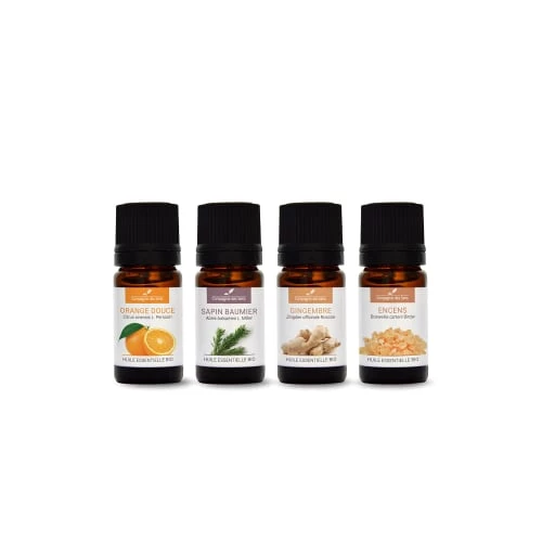 Cet assortiment se compose de 4 huiles essentielles BIO, chémotypées et intégrales aux odeurs boisées et épicées rappelant les soirées cosy de l’automne. Les huiles essentielles que nous avons choisies pour composer cette diffusion peuvent être diffusées individuellement ou toutes ensemble, c’est vous qui choisissez.Cet assortiment est composé de :- 1 huile essentielle d’Orange Douce – 5mL- 1 huile essentielle d’Encens – 5mL- 1 huile essentielle de Gingembre – 5mL- 1 huile essentielle de Sapin Baumier – 5mLLes petits + de la Compagnie :- Des huiles essentielles toutes BIO, chémotypées et 100% pures.