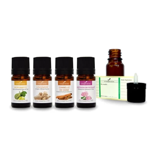 Ce pack contient :1 x BERGAMOTE – Huile essentielle BIO – 5mL1 x CANNELLE DE CHINE – Huile essentielle BIO – 5mL1 x GINGEMBRE – Huile essentielle BIO – 5mL 1 x GÉRANIUM ROSAT CV EGYPTE – Huile essentielle BIO – 5mLOfferts avec ce pack :1 x Flacon Vide – Verre Ambré – 10mL1 x Étiquette vierge1 x Livret pédagogique – 200 synergies d’huiles essentielles